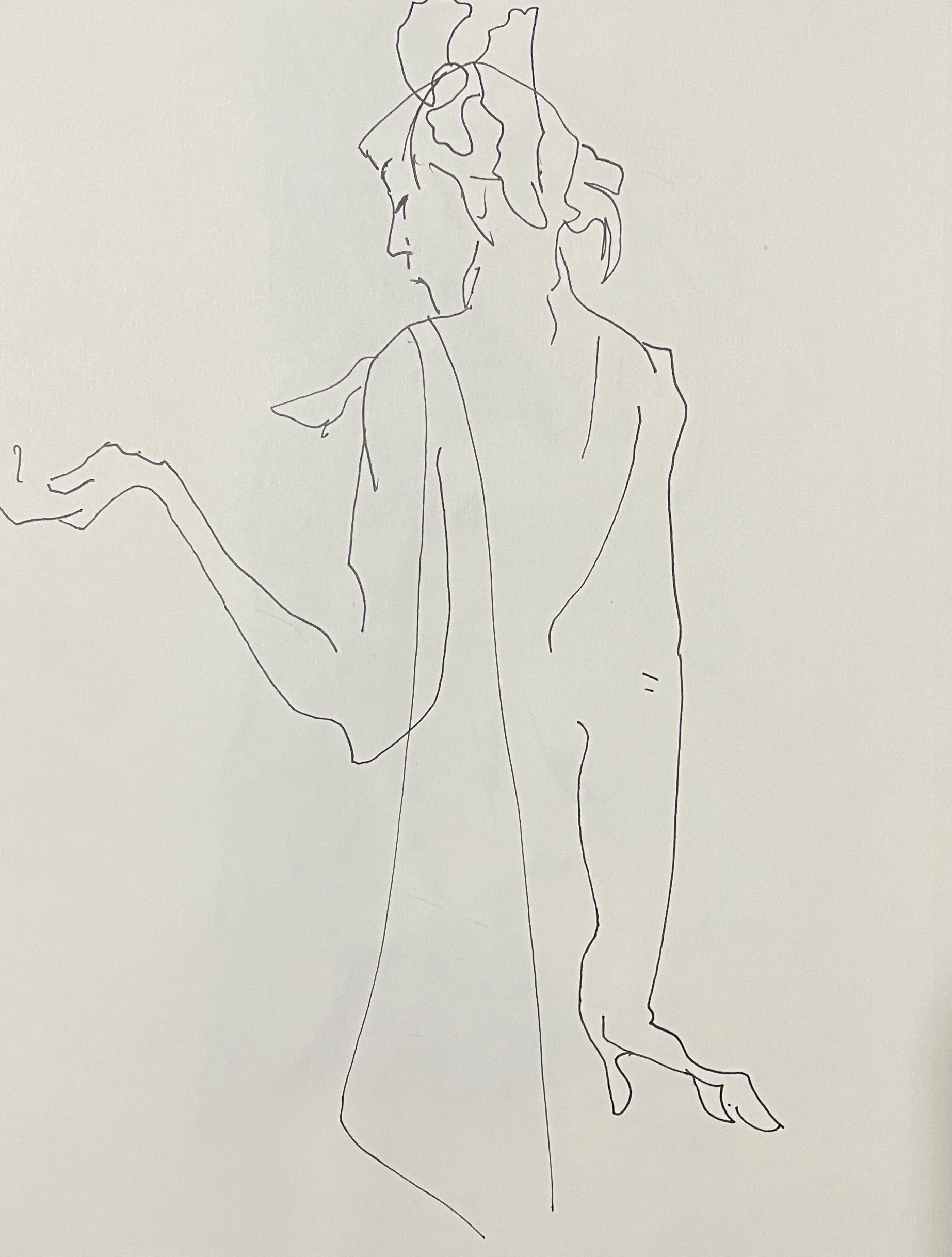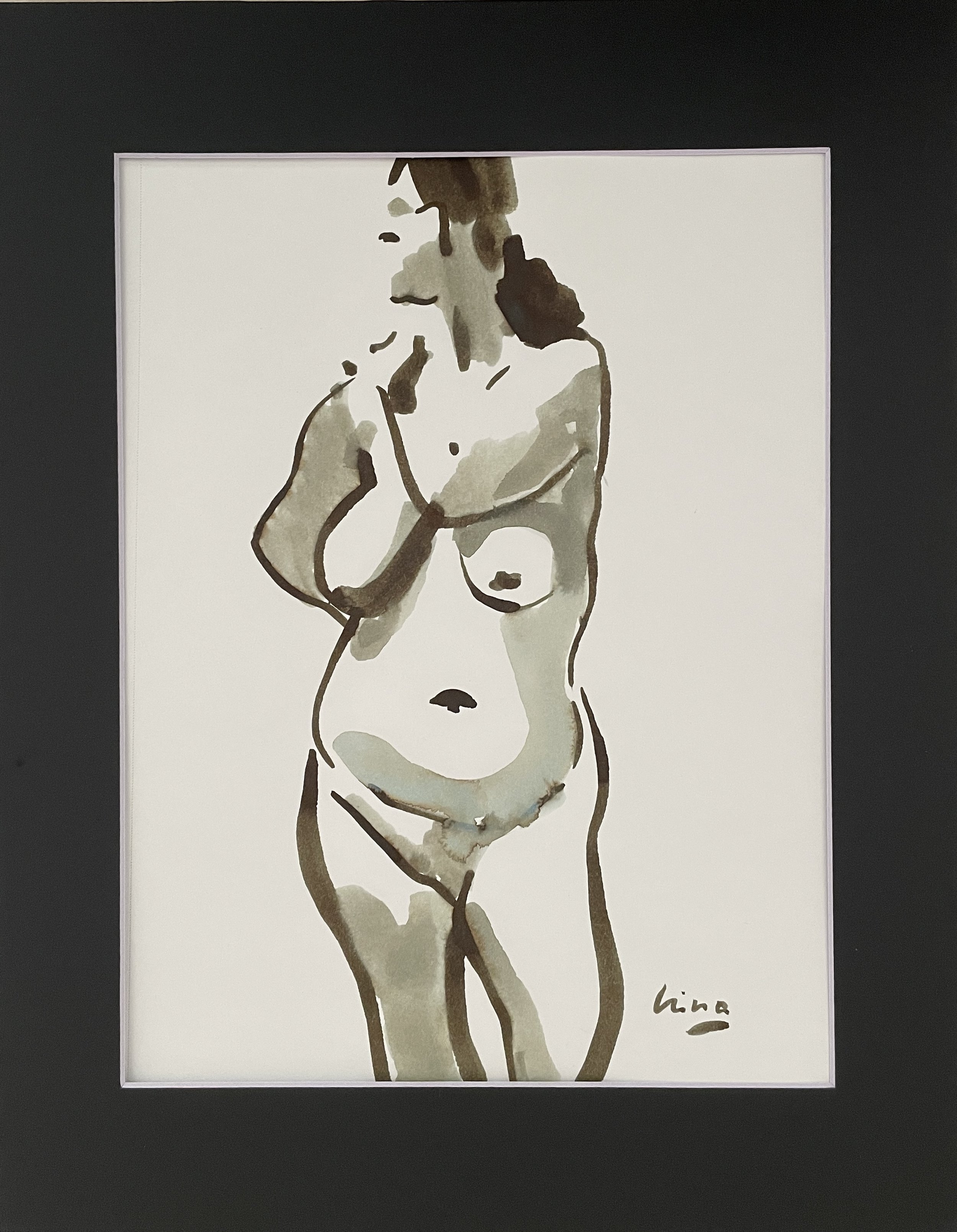 "Standing Nude", 2025, ink on Sthrathmore acid free paper 160 gms, image size 10.5"x8", framed in black acid free paper mat 14"x11", protective plastic sleeve