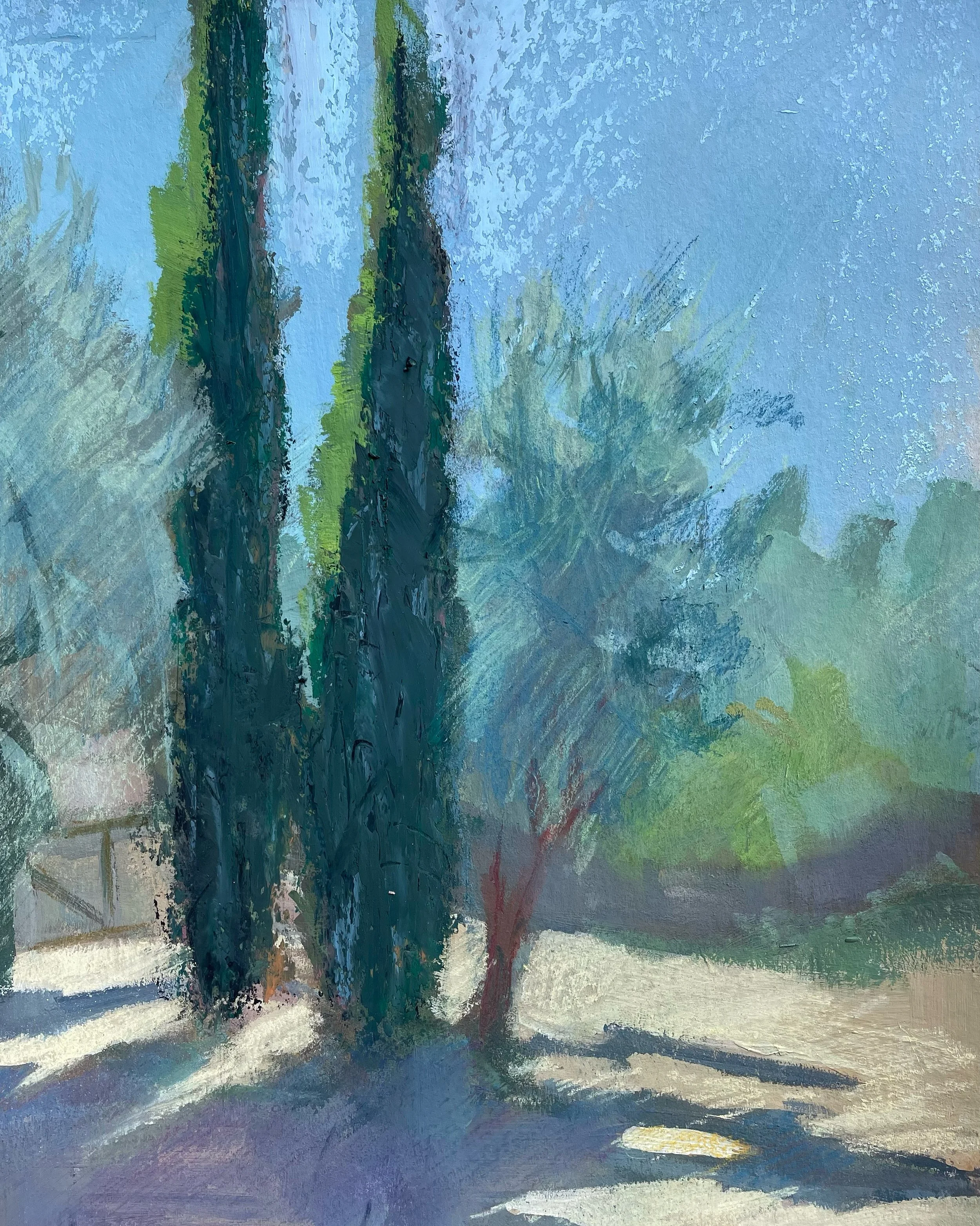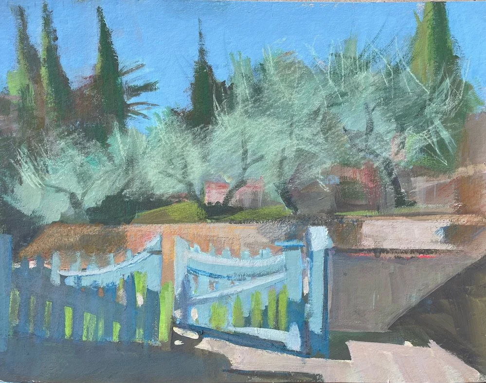 "Blue Gate, Tuscany", 2023, gouache and pastel on paper, framed in white acid free paper mat