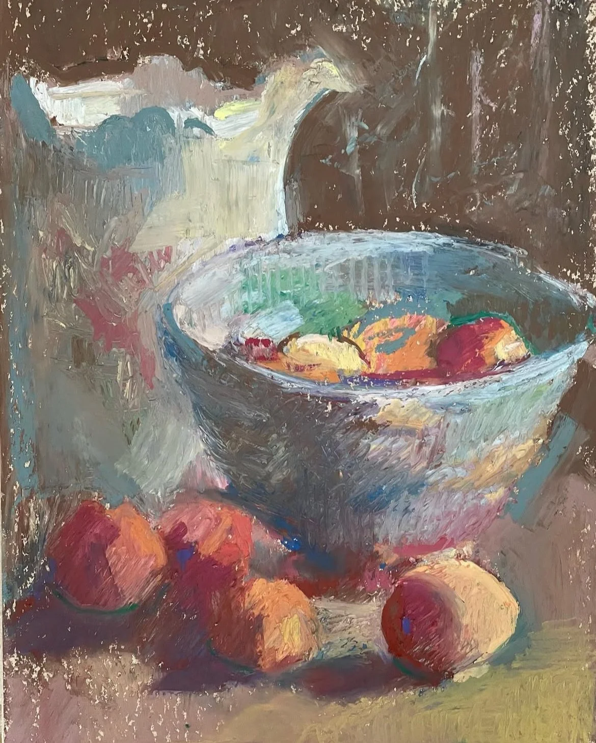 "Fruit and a white jug", oil pastels on paper, A4, framed in acid free white paper mat, 2023