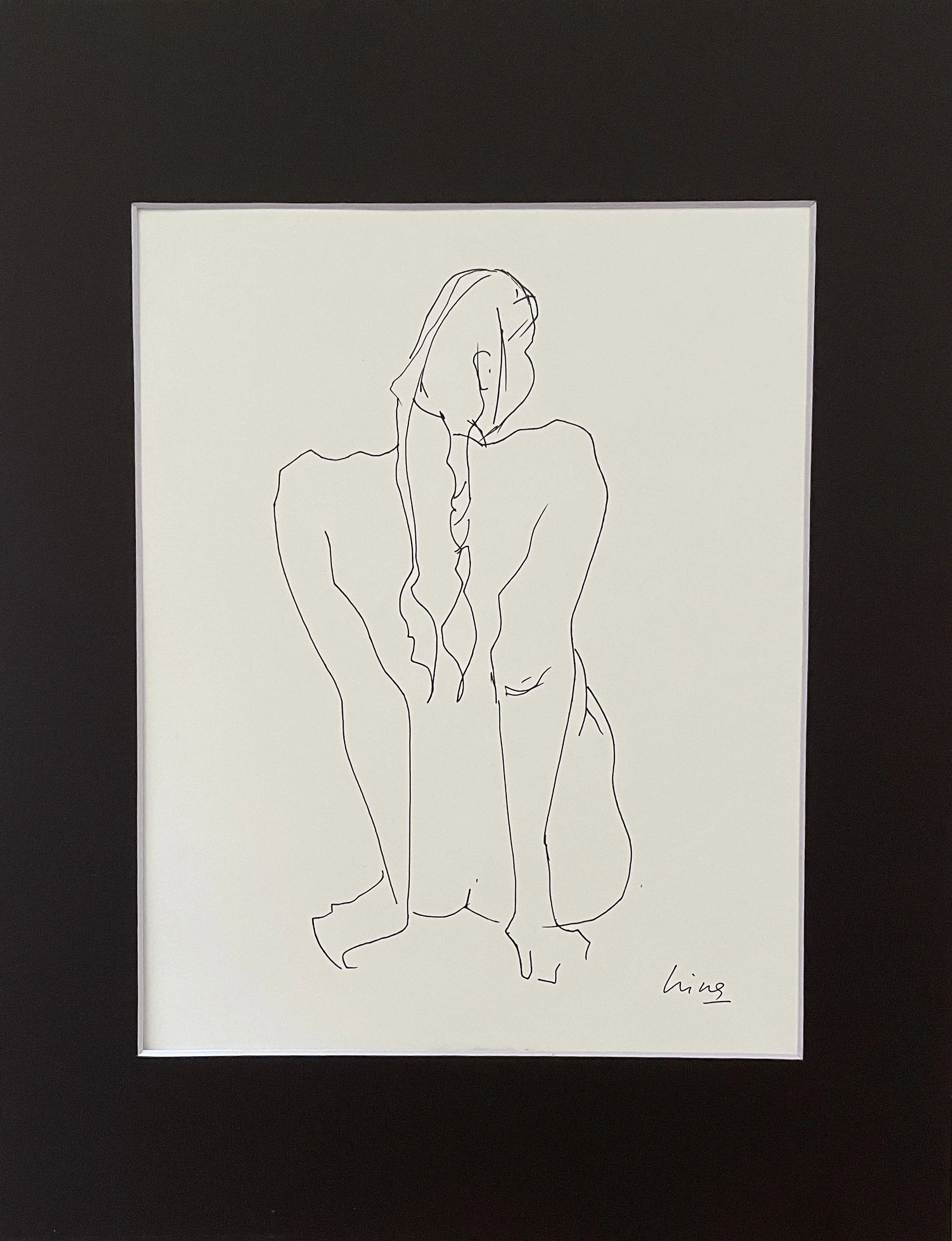 "Sitting nude", 2025, gel pen on Strathmore acid free 160 gms paper, image size 9.5"x7.5", framed in acid free black paper mat 14'x11", protective plastic sleeve