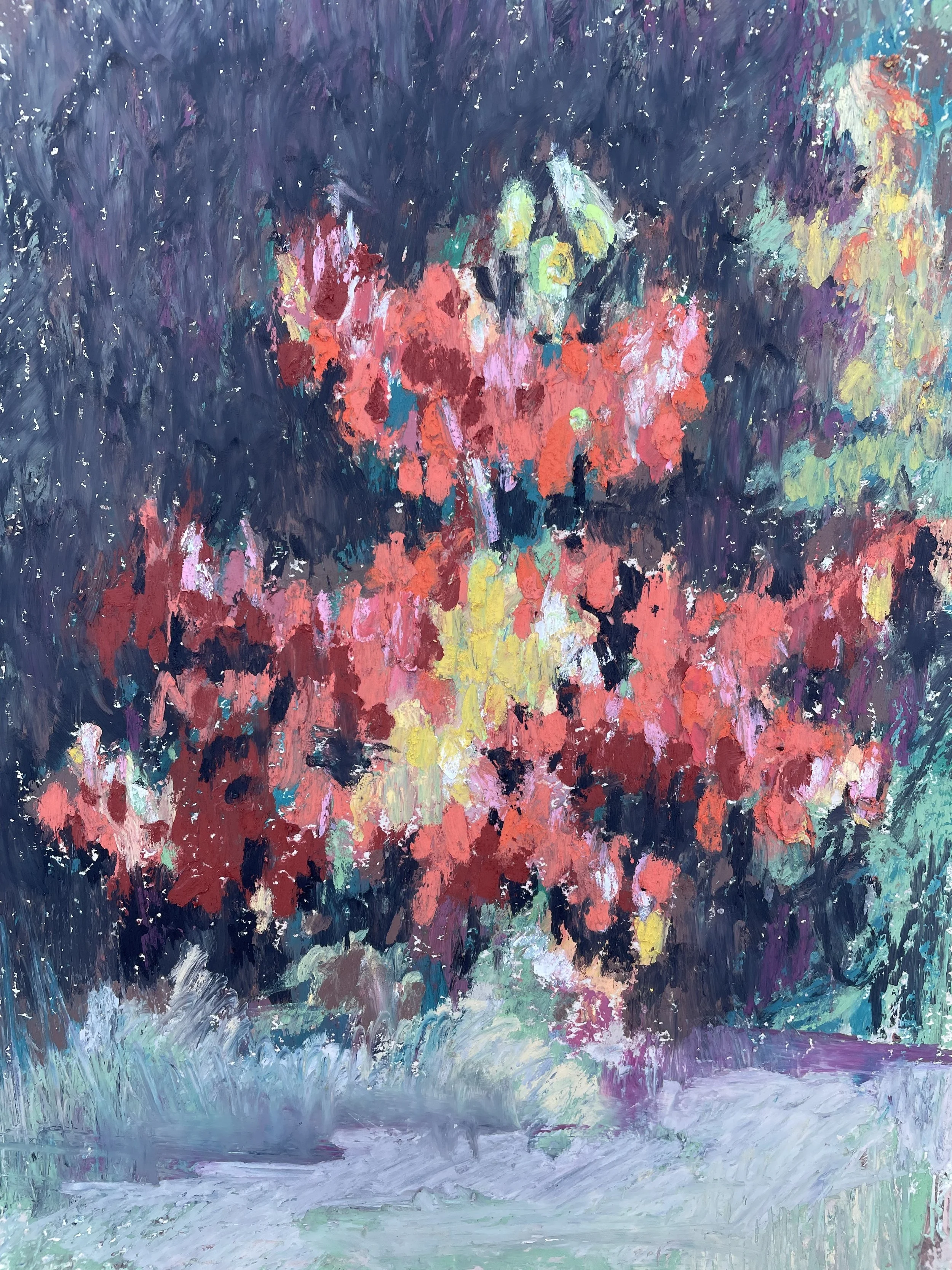 "Winter Garden", 2023, oil pastels on paper, matted, 14x11", protective plastic sleeve