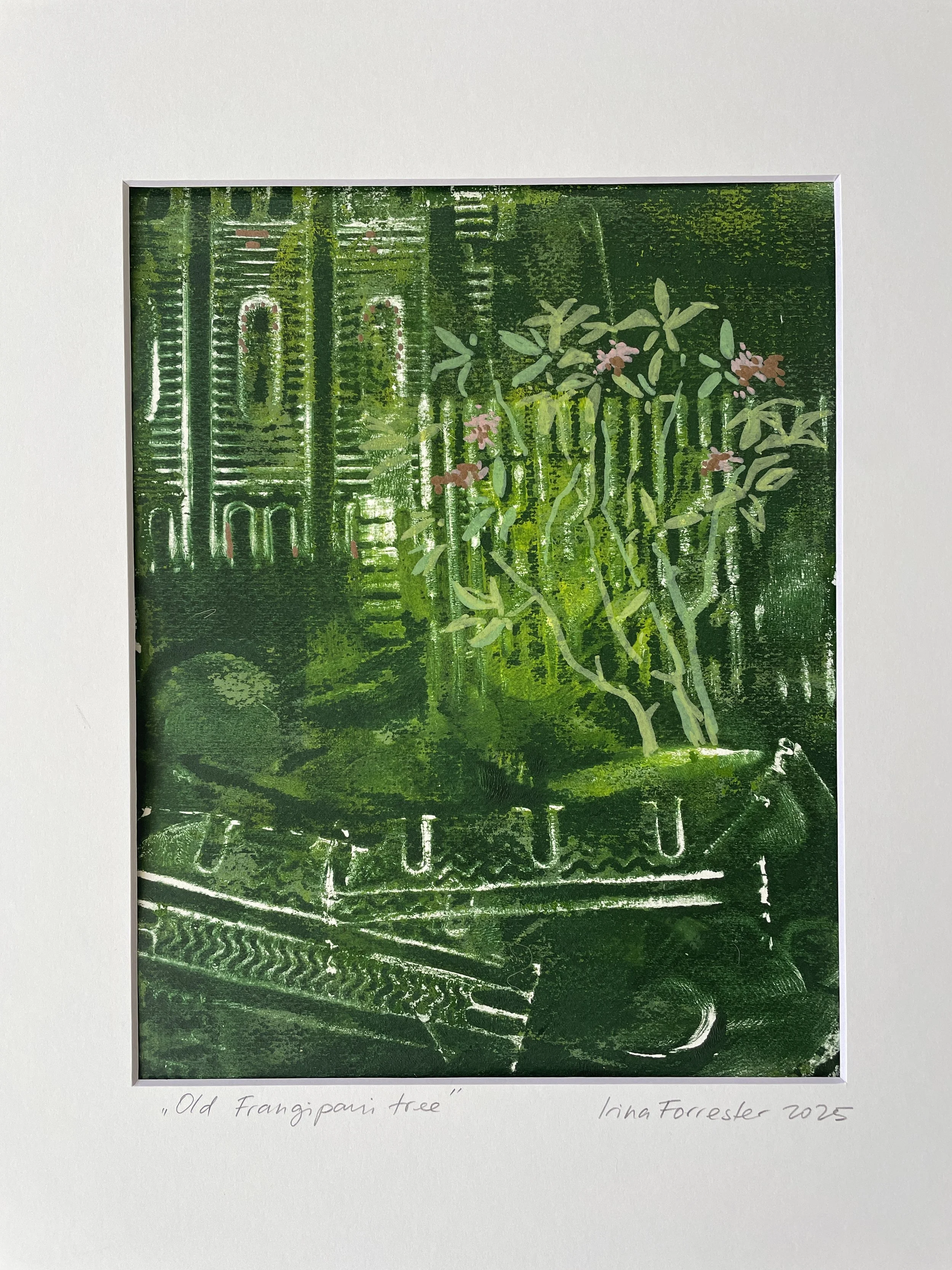 "Old Frangipani tree", 2025, monotype on 300 gsm Fabriano paper, image size 10x8' approx, framed in acid free mat 14x11", plastic sleeve provided