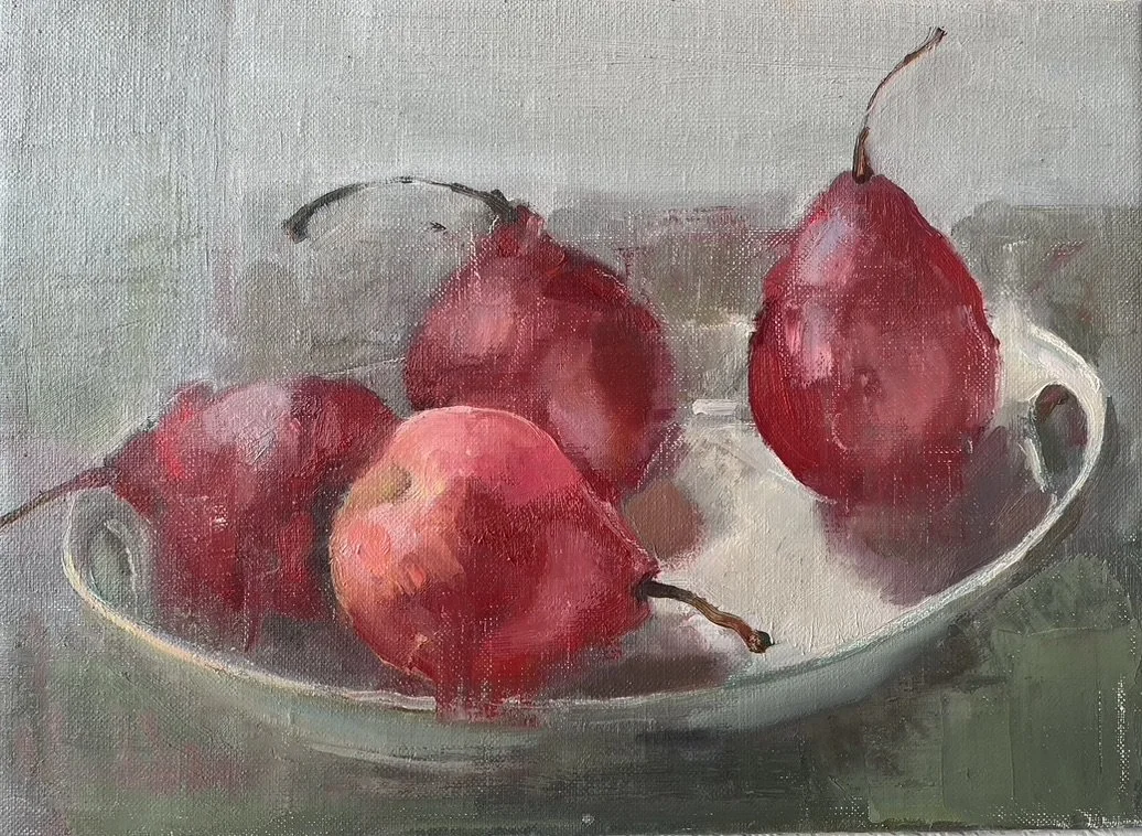 "Red pears", 2024. Oil on linen, 9x13", framed