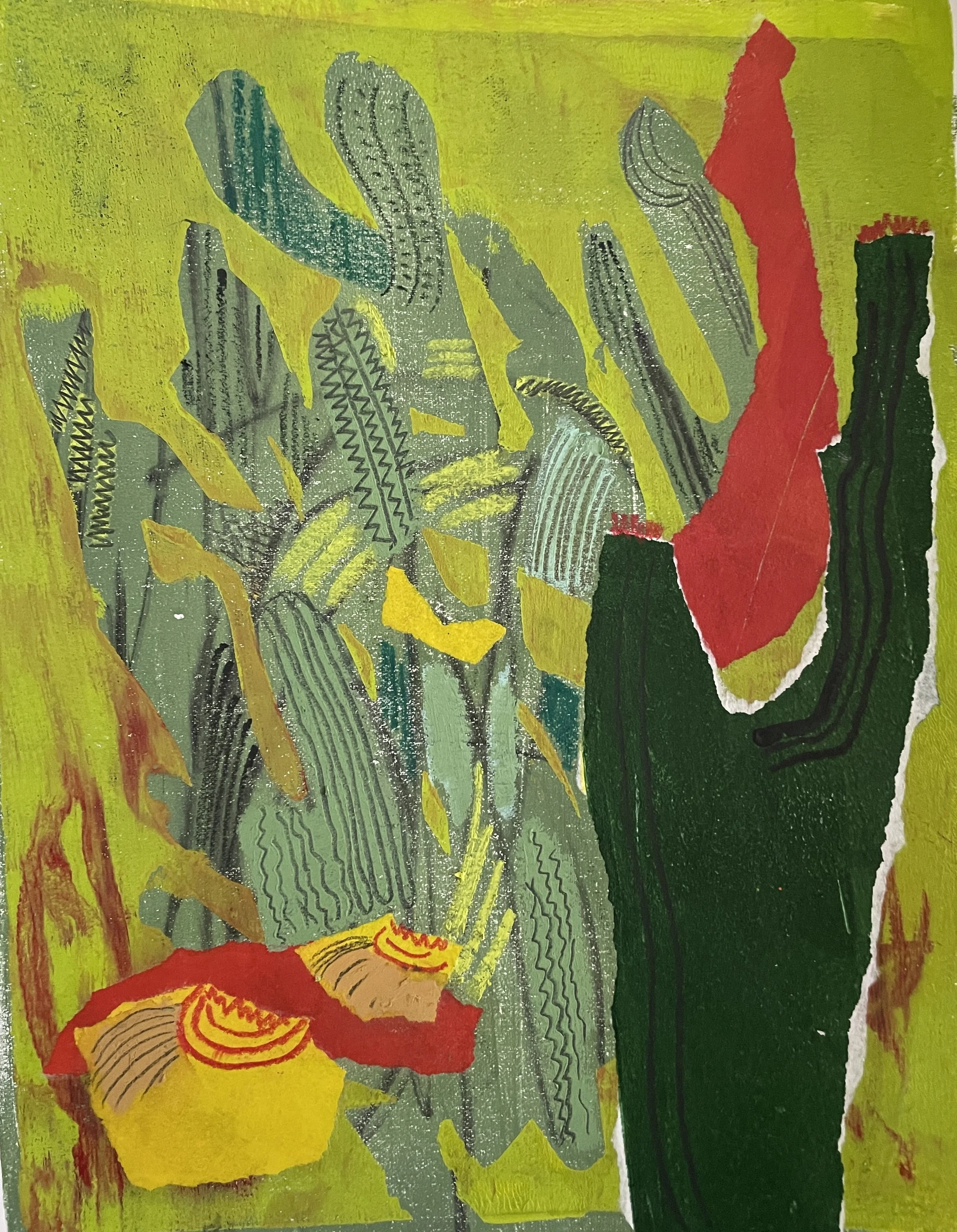 "Cacti, Spain", 2025, monotype and mixed media collage, 10x8" printed image or 14x11", when framed in acid free paper mat and plastic sleeve