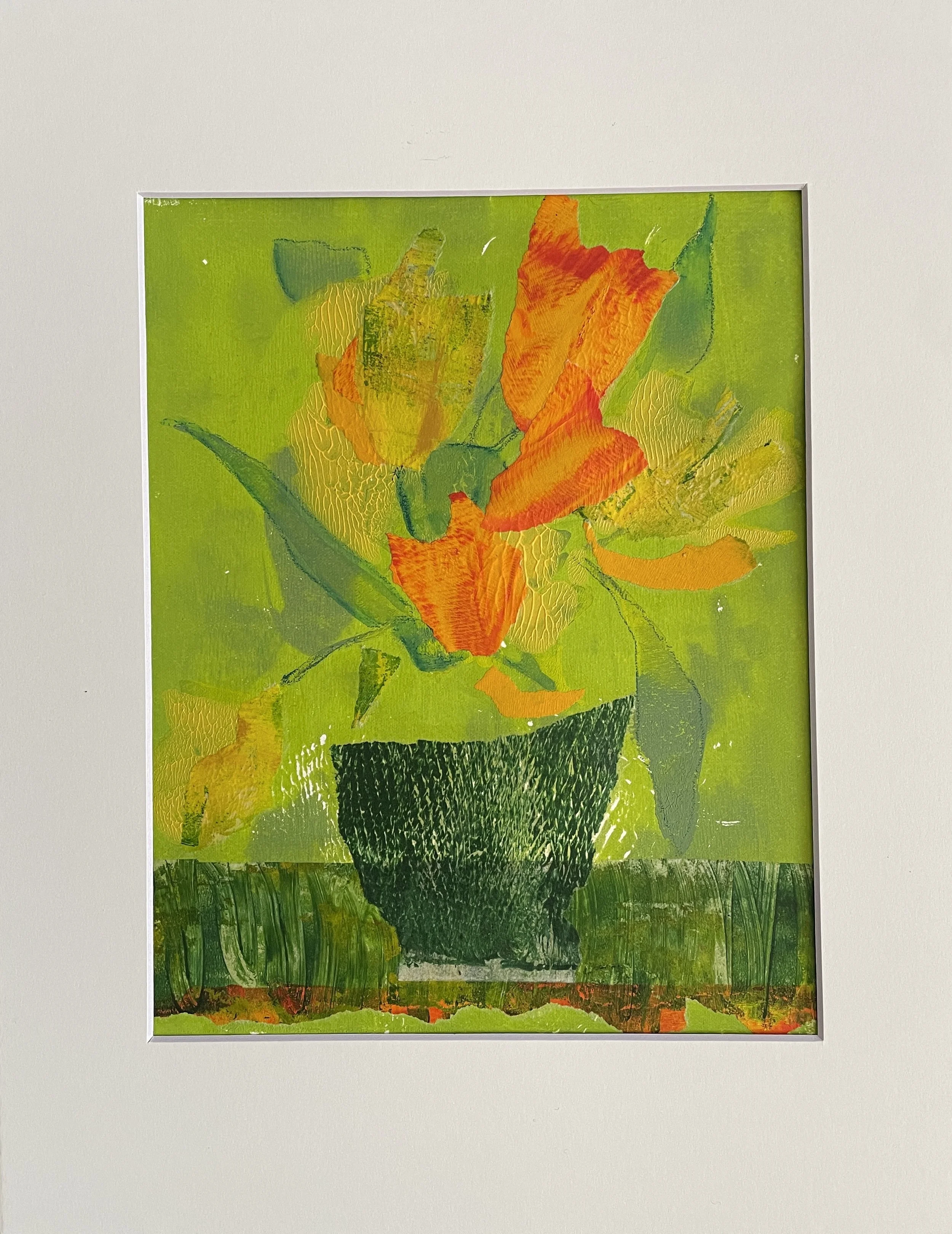 Tulips, 2025, monotype and collage on Fabriano paper 300 gsm, framed in acid free white paper mat, plastic sleeve included