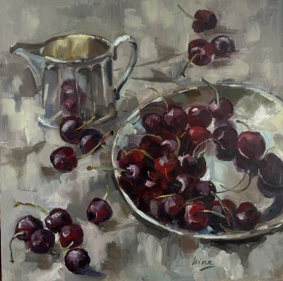 "Cherries and a silver jug", 2023, 30x30cm, oil on wood, framed